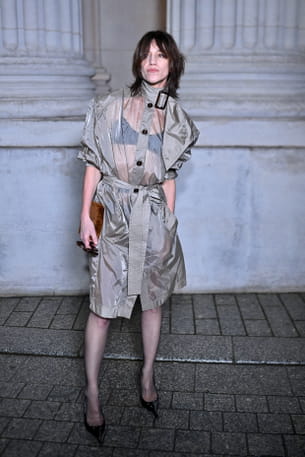 Charlotte Gainsbourg réaffirme son statut d'icône parisienne avec une tenue qui joue sur la transparence et l'irrévérence. Elle arbore une robe-trench beige glacé, dont la matière fluide et légèrement translucide laisse deviner une lingerie sobre. La taille est marquée par une ceinture nouée avec nonchalance, tandis que le col montant apporte du raffinement à son port de tête. Chaussée d'escarpins noirs vernis à bout pointu, elle équilibre sa chevelure "shag" coiffée-décoiffée par une allure ultra-pointue.