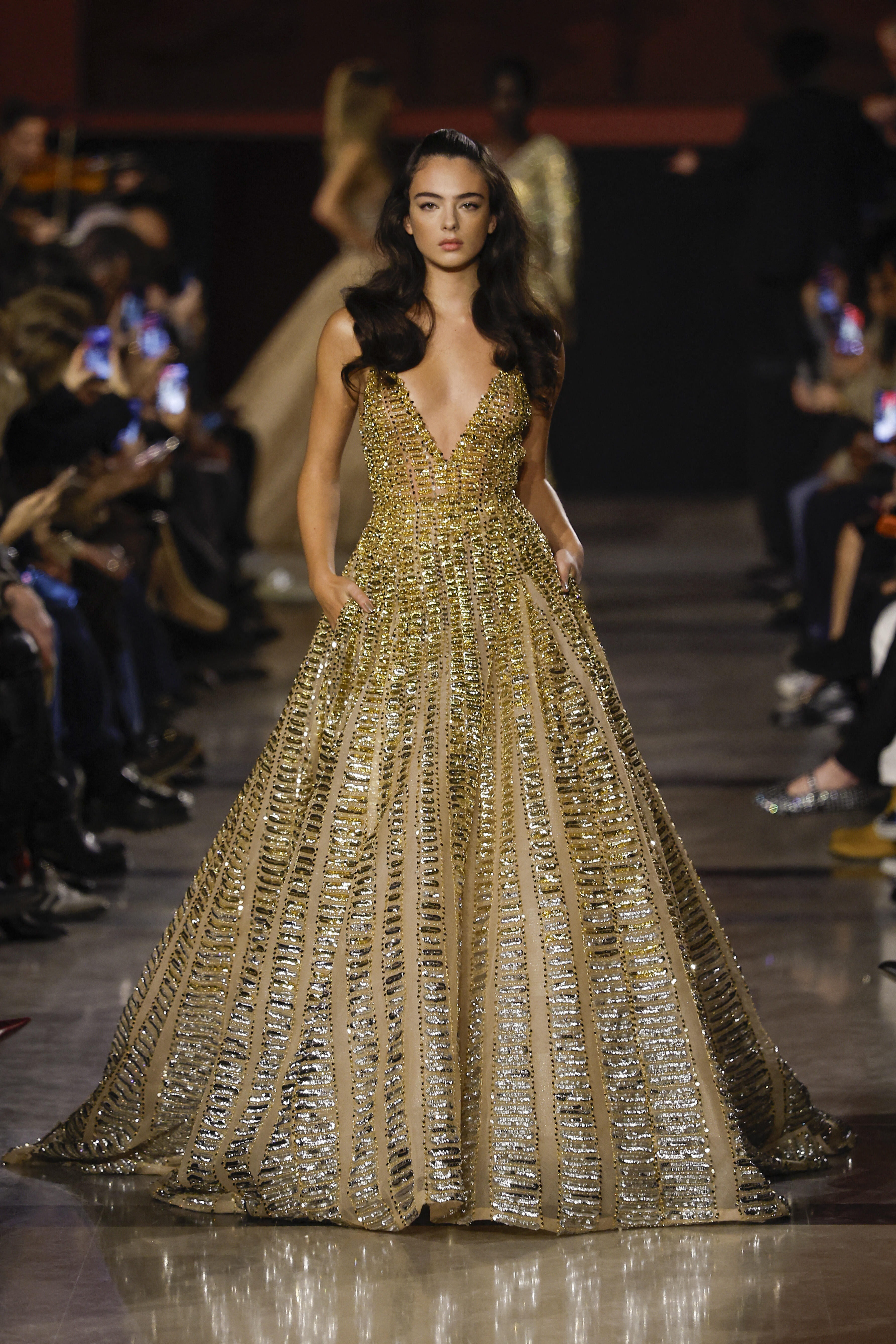 Pour le défilé Elie Saab Haute Couture, Deva Cassel incarne une femme élégante et majestueuse. Elle arbore une robe de bal de couleur champagne, magnifiée par une pluie de sequins dorés et argentés disposés en lignes verticales qui allongent sa silhouette. Le décolleté plongeant en V apporte une touche de sensualité, tandis que les poches discrètes insufflent une allure décontractée et contemporaine à cette pièce d'exception. Ses longs cheveux bruns, coiffés en ondulations souples, dégagent son visage au maquillage naturel, laissant toute la place à cette création.