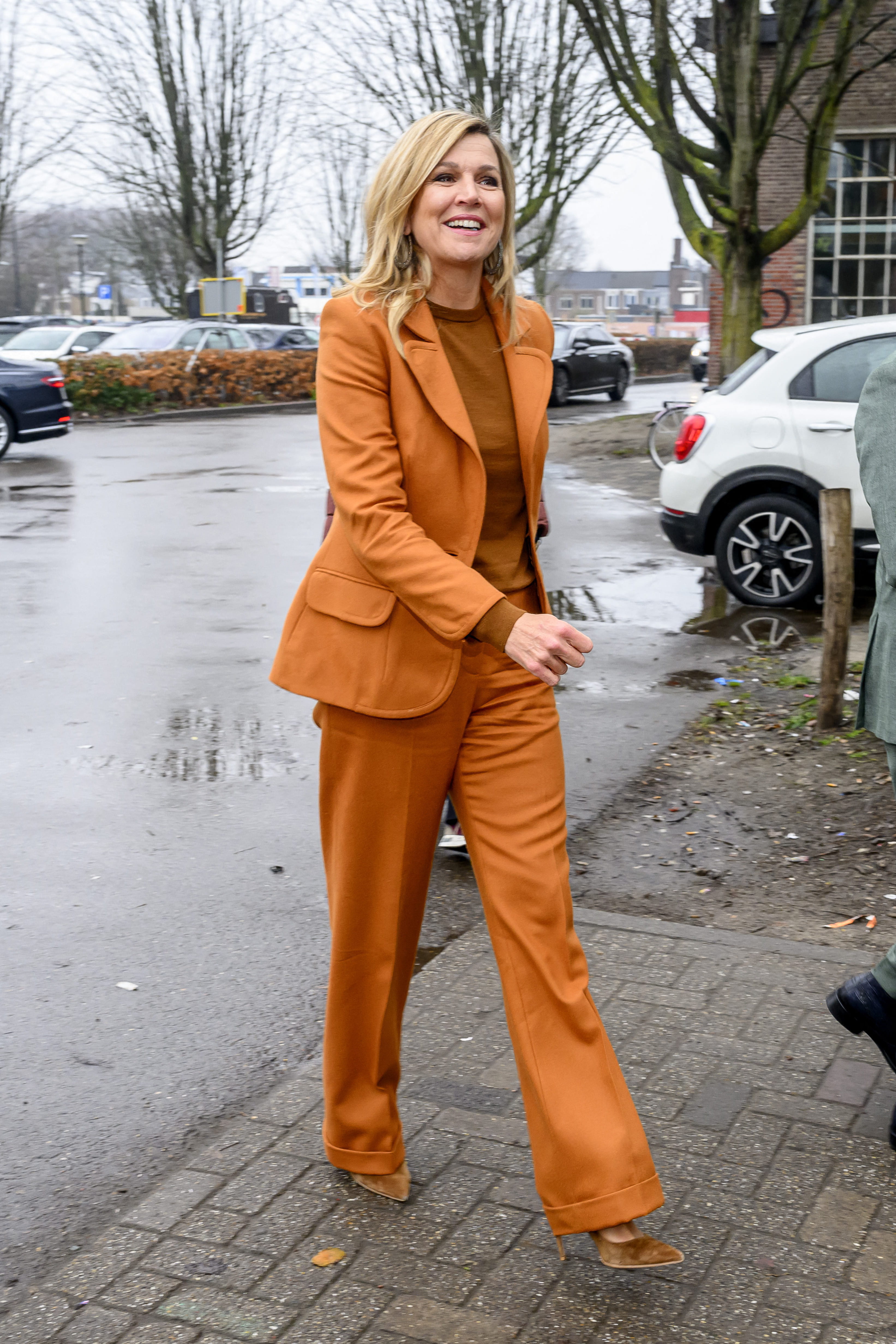 Lors d'une visite officielle, la reine Máxima des Pays-Bas rayonne dans un ensemble monochrome ocre particulièrement lumineux. Elle porte un tailleur-pantalon parfaitement coupé, composé d'une veste cintrée à larges revers et d'un pantalon fluide qui allonge sa démarche. Sous sa veste, un pull en maille fine d'un ton terre de Sienne complète ce dégradé automnal. Fidèle à son sens du détail, elle accessoirise sa tenue avec des escarpins en daim assortis et d'imposantes créoles. Sa chevelure blonde naturelle et son sourire franc soulignent son allure royale.