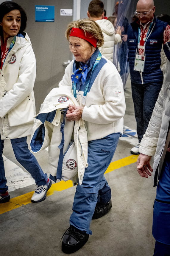 Sonja de Norvège a récemment fait le déplacement en Italie afin d'encourager les athlètes norvégiens aux Jeux Olympiques d'hiver. Pour cette sortie, la souveraine arborait des vêtements techniques dont un pull en moumoute à la fois écru et bleu. Une pièce confortable, dotée d'un col zippé et coordonnée à un pantalon de ski et à une veste de la même couleur. La touche mode ? Le foulard imprimé qu'elle avait noué autour de son cou. Elle avait également misé sur un bandeau teinté d'un rouge vif dans les cheveux et sur une paire de Moon Boots aux pieds.