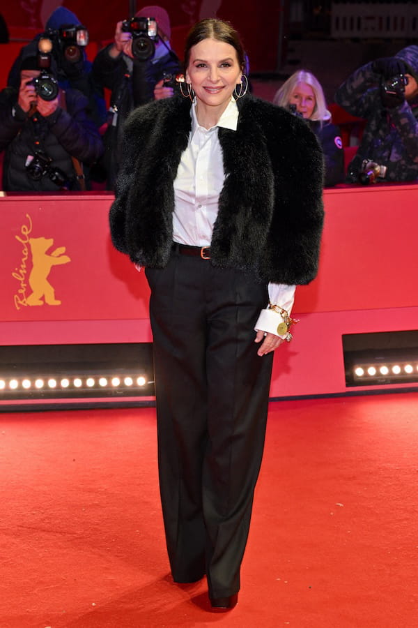 Juliette Binoche a fait une apparition ultra-stylée à la première de Queen at Sea lors de la 76e édition du Festival international du film de Berlin. Elle avait enfilé pour l'occasion une veste XXL en fourrure, aux manches mi-longues, qui faisait office de pièce maîtresse de la tenue. La comédienne française portait également une simple chemise blanche rentrée à l'intérieur d'un pantalon noir aux jambes droites. Le clou du spectacle ? Ses bijoux et plus particulièrement le bracelet imposant qui mêlait or et argent autour de son poignet.