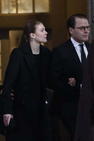 Pour assister aux funérailles de la princesse Désirée de Suède, Estelle de Suède privilégie une élégance sobre et accessible avec ce manteau noir de la marque Mango. Cette pièce en laine mélangée, à la coupe classique et au double boutonnage structure sa silhouette sans en faire trop. En choisissant une marque de prêt-à-porter abordable, la princesse affiche une image moderne et proche de sa population. Associé à une tenue monochrome noire et une queue-de-cheval haute, ce look souligne son élégance naturelle tout en respectant la solennité de l'événement.