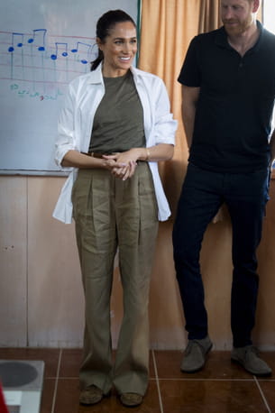 Meghan Markle adopte un look "effortless chic" aux tonalités terreuses et naturelles. Elle porte un pantalon à pinces taille haute de couleur kaki, dont la coupe fluide allonge sa silhouette. Ce bas est associé à un t-shirt coordonné, créant une base monochrome harmonieuse, rehaussée par une fine ceinture en cuir marron qui structure la taille. Par-dessus, une chemise blanche déboutonnée apporte de la lumière comme il se doit. Des mocassins en daim et un bracelet doré discret complètent cette tenue décontractée.