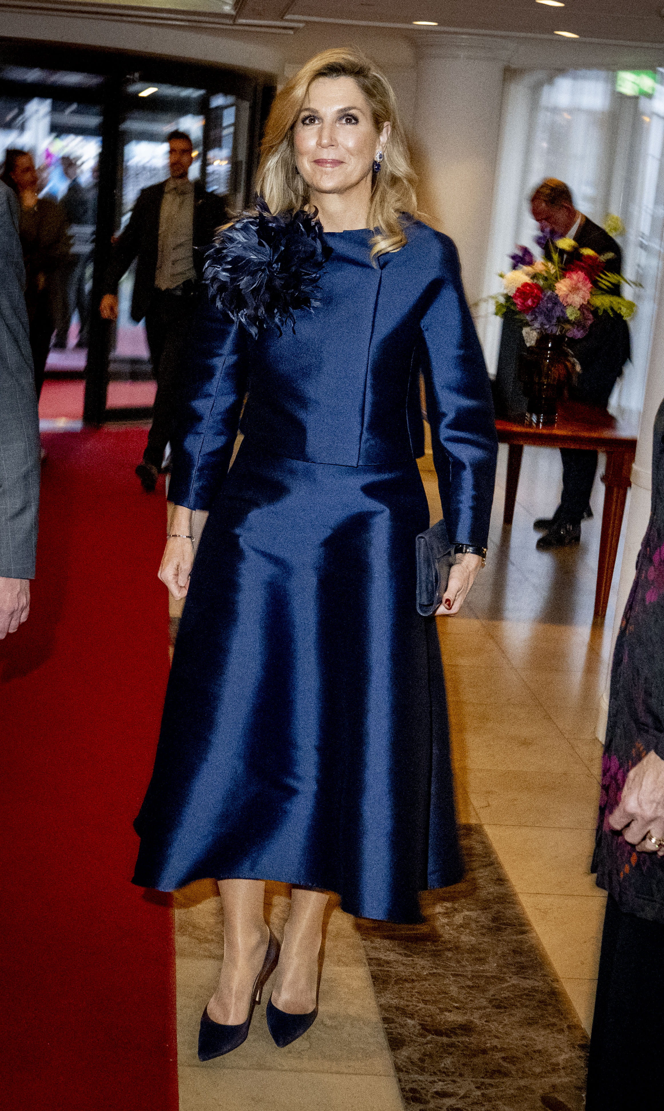 Máxima des Pays-Bas est éblouissante dans cet ensemble en soie bleu nuit. La veste courte, aux manches structurées et à la coupe droite, apporte une rigueur royale immédiatement adoucie par une imposante broche florale en plumes sur l'épaule. Cette pièce forte dynamise la silhouette et attire le regard vers son visage. La jupe évasée à la longueur midi offre du mouvement à chaque pas. En misant sur un total look monochrome et des accessoires coordonnés, elle incarne un glamour contemporain parfaitement maîtrisé.