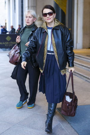 À Milan, Juliette Binoche propose une version sophistiquée du style urbain avec ce look. Elle porte un blouson en cuir noir boxy à la finition satinée, superposé à une veste légère à capuche kaki, créant un contraste de matières tendance. Le haut se compose d'un top en maille bleu ciel bordé de rayures au col, rentré dans une jupe midi plissée bleu marine. Cette silhouette, complétée par des bottes hautes en cuir noir et des lunettes de soleil imposantes, mêle habilement les codes du sportswear à ceux de l'élégance.