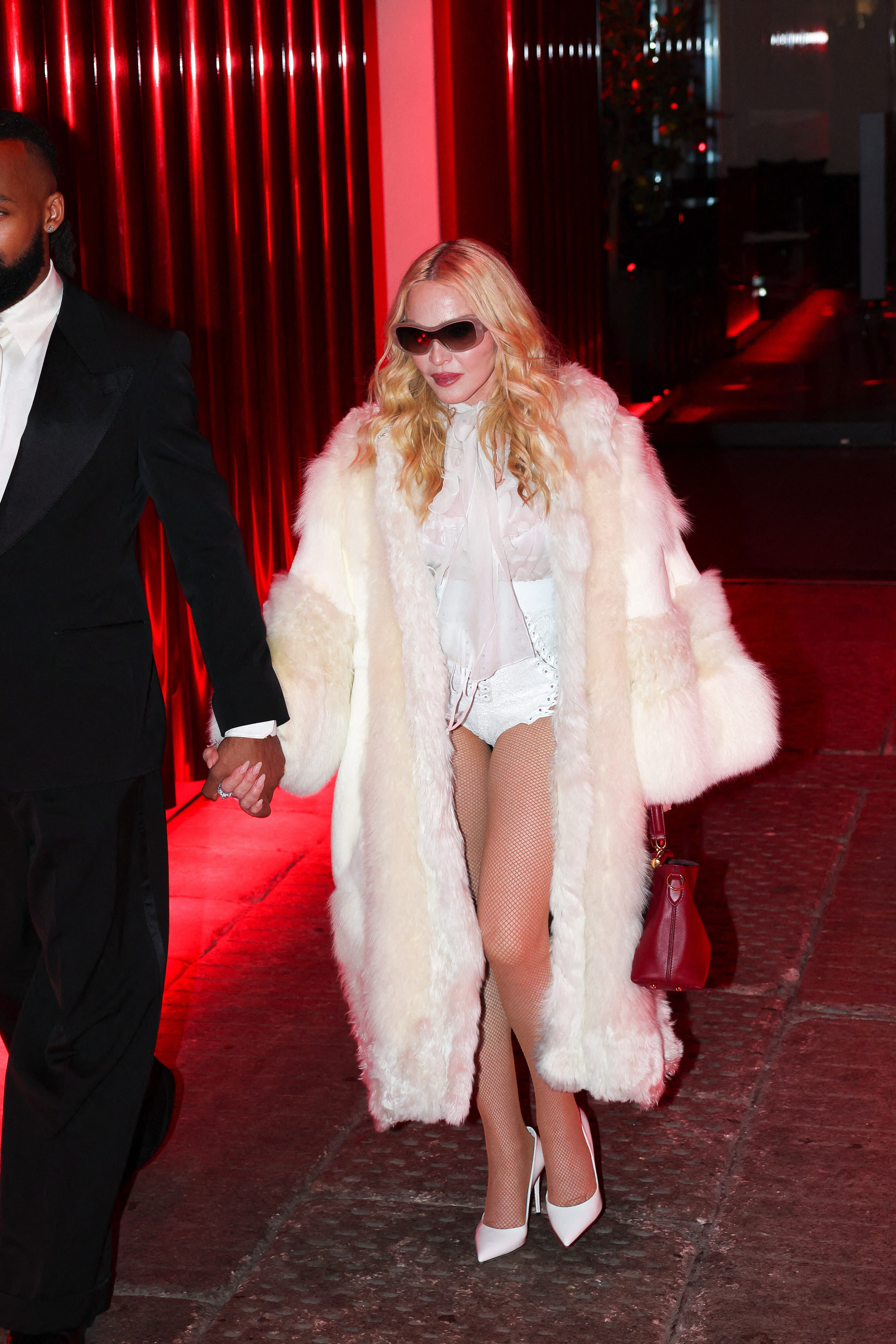 Madonna impose son style iconique avec une silhouette audacieuse jouant sur le volume et la transparence. Elle porte un manteau en fausse fourrure crème oversize, véritable pièce mode par excellence ! La star ose le contraste avec un ensemble de lingerie blanche et une blouse vaporeuse à col lavallière pour un look boudoir-chic à tomber. Des collants résille, des escarpins blancs pointus et un sac à main rouge vibrant viennent parfaire ce look provocateur et sophistiqué, fidèle à son statut de reine de la pop.