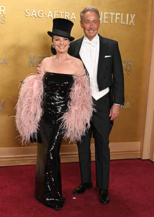 Fran Drescher illumine le tapis rouge des 32e Annual Actor Awards dans une robe fourreau à sequins noirs qui épouse parfaitement sa morphologie. Elle complète son look par une étole vaporeuse en plumes rose poudré, ajoutant une touche de douceur et de glamour hollywoodien. L'accessoire phare est son haut-de-forme noir, qui apporte une note théâtrale et espiègle. À ses côtés, son compagnon opte pour un smoking impeccable en queue-de-pie noire, chemise à plastron blanche et nœud papillon coordonné.