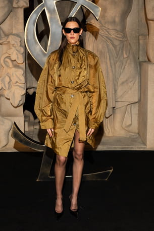 Au défilé Saint Laurent, Charlotte Cardin adopte une esthétique baroudeuse-chic. Elle porte une robe-manteau courte de couleur ocre doré, dont la texture froissée apporte du relief. La pièce se distingue par un col montant à boucle, des manches bouffantes et une taille marquée par une ceinture à nouer, structurant sa silhouette avec audace. Perchée sur des escarpins noirs vernis à bout pointu et arborant des lunettes de soleil noires rectangulaires, la star offre un look élégant et à l'image de la maison française.
