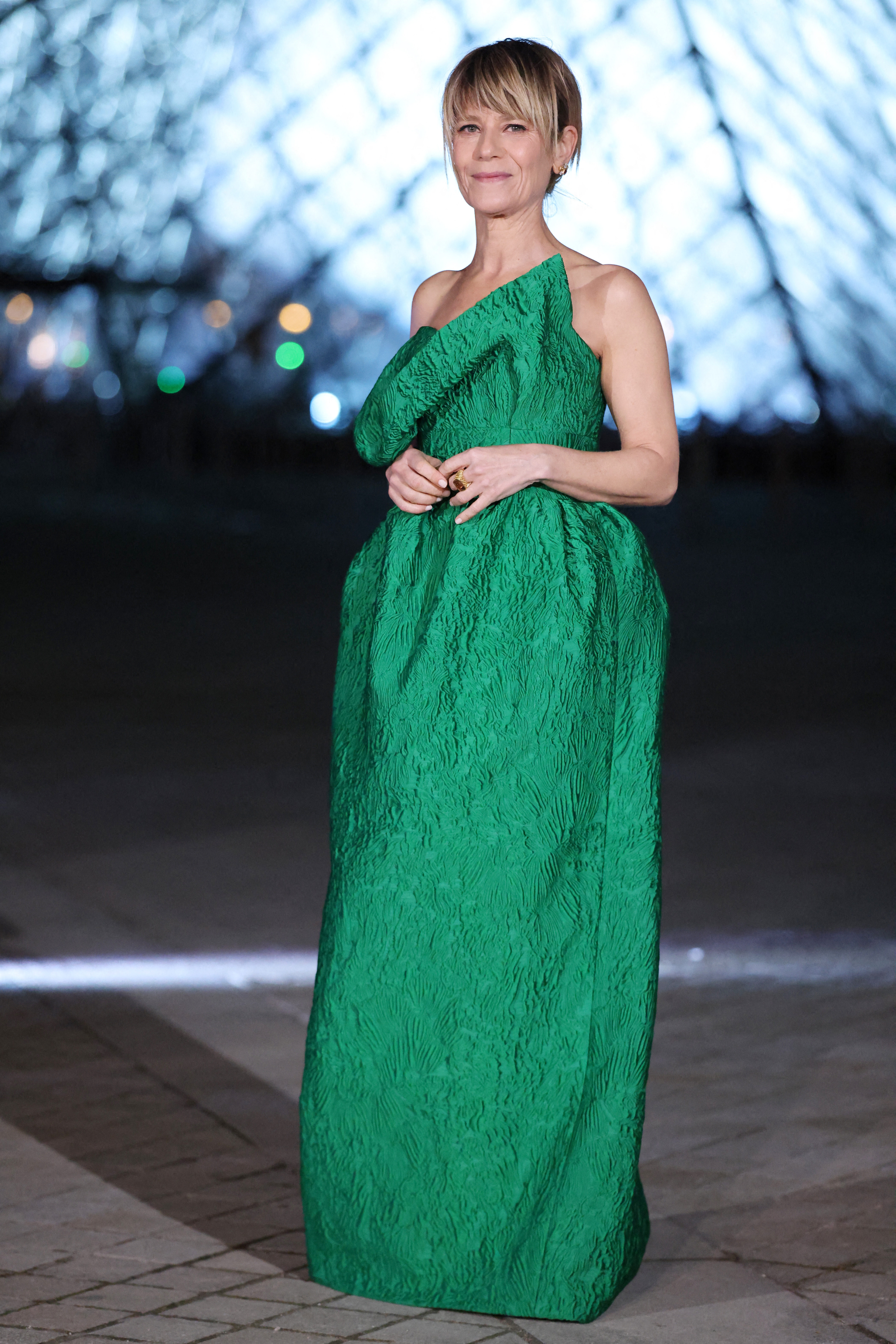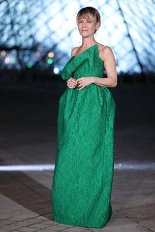 Conviée au grand dîner du Louvre, Marina Foïs en impose dans cette robe bustier vert émeraude à la texture gaufrée. La pièce se distingue par un volume "bulle" audacieux au niveau des hanches et un drapé asymétrique sur la poitrine, structurant sa morphologie comme il se doit. Ce choix de couleur vibrante souligne son goût pour une mode conceptuelle, loin des standards classiques du tapis rouge. Avec sa coupe de cheveux courte et effilée, elle met en avant une féminité assumée et un style singulier.