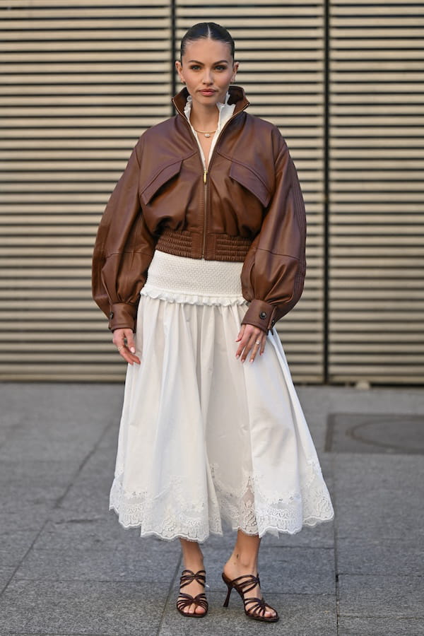 Thylane Blondeau a séduit la sphère mode avec le choix de son look au défilé Zimmermann automne-hiver 2026-2027 lors de la fashion week de Paris. Au programme ? Une veste en cuir oversize dans un marron doux, pièce ultra-tendance du moment. Elle l'associait à une jupe blanche sublimée par un ourlet en dentelle, apportant une touche délicate à l'ensemble. Pour compléter la tenue, le mannequin misait sur de hautes sandales à lanières qui annoncent déjà l'arrivée imminente du printemps. Le chic à l'état pur !