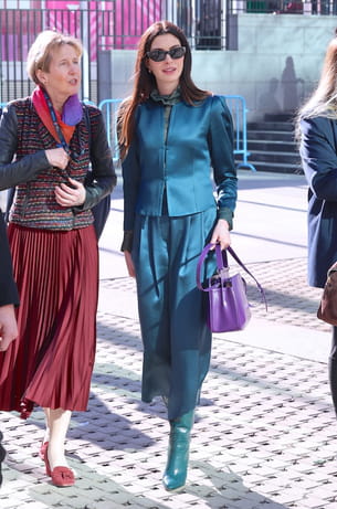 Anne Hathaway s'est rendue au siège des Nations Unies à New York, ce lundi 9 mars, afin de prononcer un discours à l'occasion de la Journée internationale de la femme. Pour cette prise de parole, elle avait misé sur un ensemble monochrome signé Giorgio Armani : sa veste aux manches bouffantes et son pantalon culotte étaient tous deux confectionnés dans un tissu de soie bleu canard. Le chemisier aux fils scintillants, le sac à main violet et les bottes pointues insufflaient enfin une touche de contraste à ce look sophistiqué.