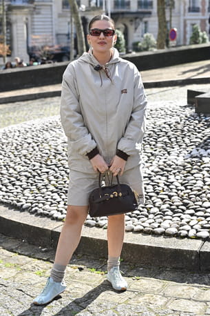 Invitée au premier rang du défilé automne-hiver 2026-2027 de Miu Miu à la Fashion week de Paris, Louane s'est illustrée dans une allure aux accents sportswear. Elle portait une veste à capuche esprit coupe vent, agrémentée de cordons marron, et un short arborant le logo de la marque. Afin d'accessoiriser l'ensemble, la chanteuse avait choisi les baskets Plume gris clair, laissant dépasser des chaussettes montantes, ainsi qu'un sac à main chocolat et des lunettes de soleil aux verres orangés. Un look résolument tendance !