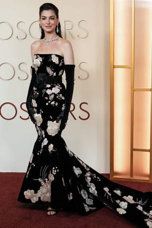 Il y avait du beau monde sur le tapis rouge des Oscars 2026 ! Anne Hathaway, évidemment, était présente et elle s'est fait remarquer avec son look issu de la collection "Specula Mundi" de Valentino. Celui-ci se démarquait par une robe bustier à la coupe sirène qui se termine avec traine, recouverte de délicates fleurs de cerisiers roses et marquée à la taille par une ceinture XXL. Pour aller avec, la star avait misé sur des gants en satin remontant le long des bras, des escarpins Roger Vivier et des bijoux en diamants.