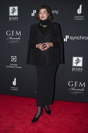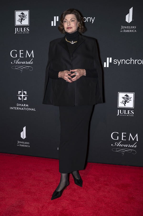 Linda Evangelista a le chic pour arborer des looks à la pointe de la mode. Nouvelle démonstration sur le tapis rouge des GEM Awards où elle s'est montrée dans un total look noir d'une élégance absolue. Le top model des années 90 avait opté pour un blazer cape qui surmontait une maxi robe moulante dotée de manches longues et d'un col roulé. Afin de ponctuer avec encore plus de classe son allure, elle arborait un collier serti d'une pierre imposante, porté par-dessus la tenue, ainsi que des bagues statement.