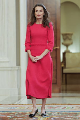Incarnation du chic et de l'élégance, Letizia d'Espagne a une nouvelle fois marqué les esprits lors d'une réception en l'honneur des champions des Jeux paralympiques 2026 le 17 mars dernier. Ce qui a retenu l'attention ? Sa robe midi en tweed rose fuchsia. La reine portait un modèle manches trois-quarts arrivant au milieu des jambes et rehaussé d'un liseré effiloché. Elle avait choisi de l'associer à une paire de talons noirs Magrit et à des boucles d'oreilles Dime Que Me Quieres ornées de pierres multicolores.