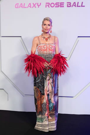 Pour assister au Bal de la Rose, Kitty Spencer a misé sur une fusion magistrale entre l'opulence baroque et l'audace contemporaine. Son look original captivait par son contraste de textures : un bustier rigide aux broderies corail et argent surmontait une jupe longue évoquant une tapisserie de la Renaissance. Le détail incroyable résidait dans des manchons de plumes rouges vif, qui apportaient une touche théâtrale. Complétée par une parure de bijoux imposante et un chignon bas impeccablement lissé, cette tenue transforme la mode en un art presque poétique.