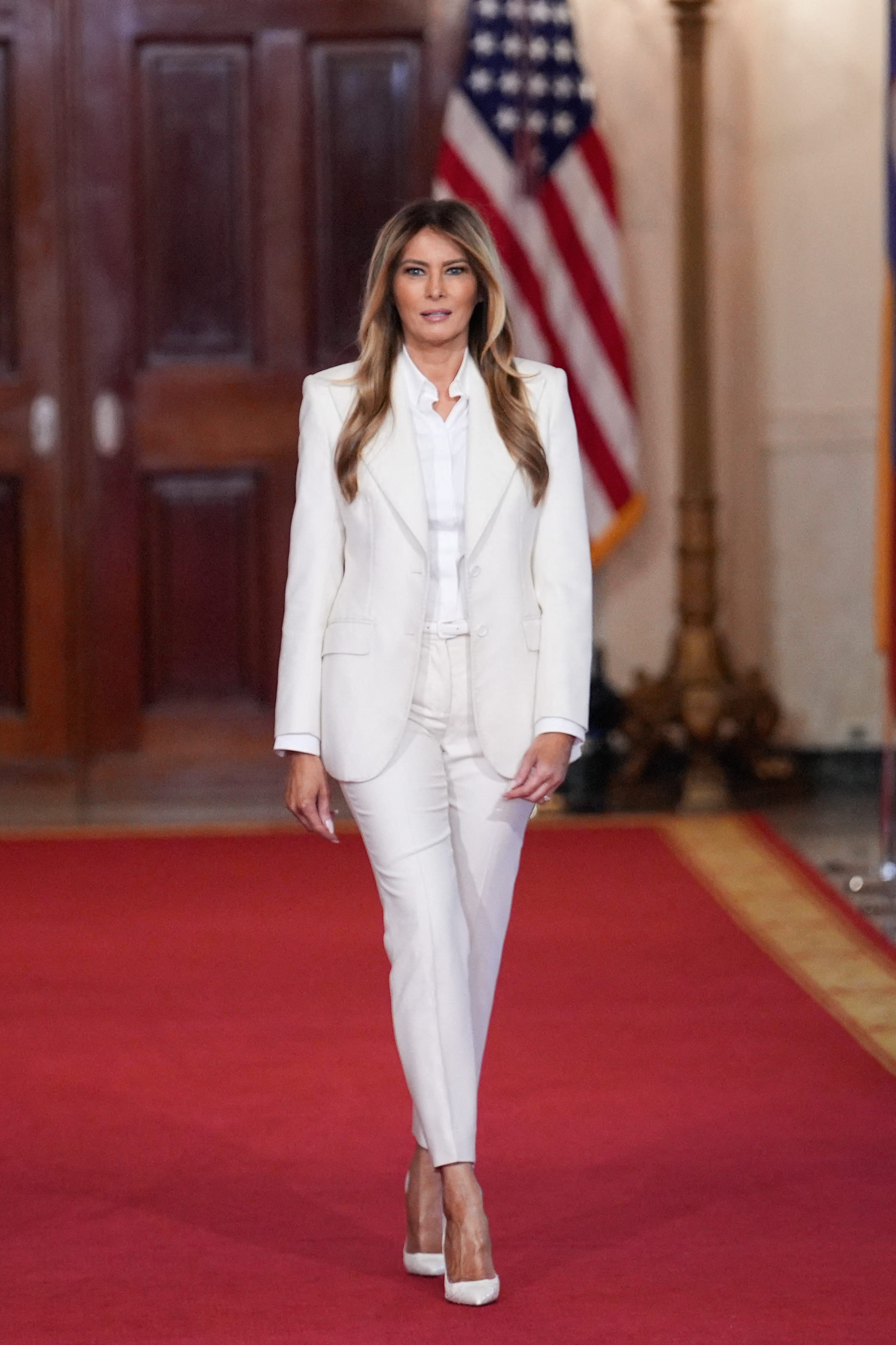 Ce mercredi 25 mars, Melania Trump a participé à un sommet sur la protection des enfants à l'ère numérique. Pour l'occasion, l'épouse du président a sorti de son dressing une tenue immaculée qui sentait bon la saison douce. En effet, elle portait un pantalon 7/8, un chemisier cintré et une veste de blazer ajustée. Trois pièces blanches et stylées, très faciles à accorder ensemble. Aux pieds, elle avait enfilé des escarpins blancs à bout pointu qui mettaient parfaitement en valeur son hâle doré.
