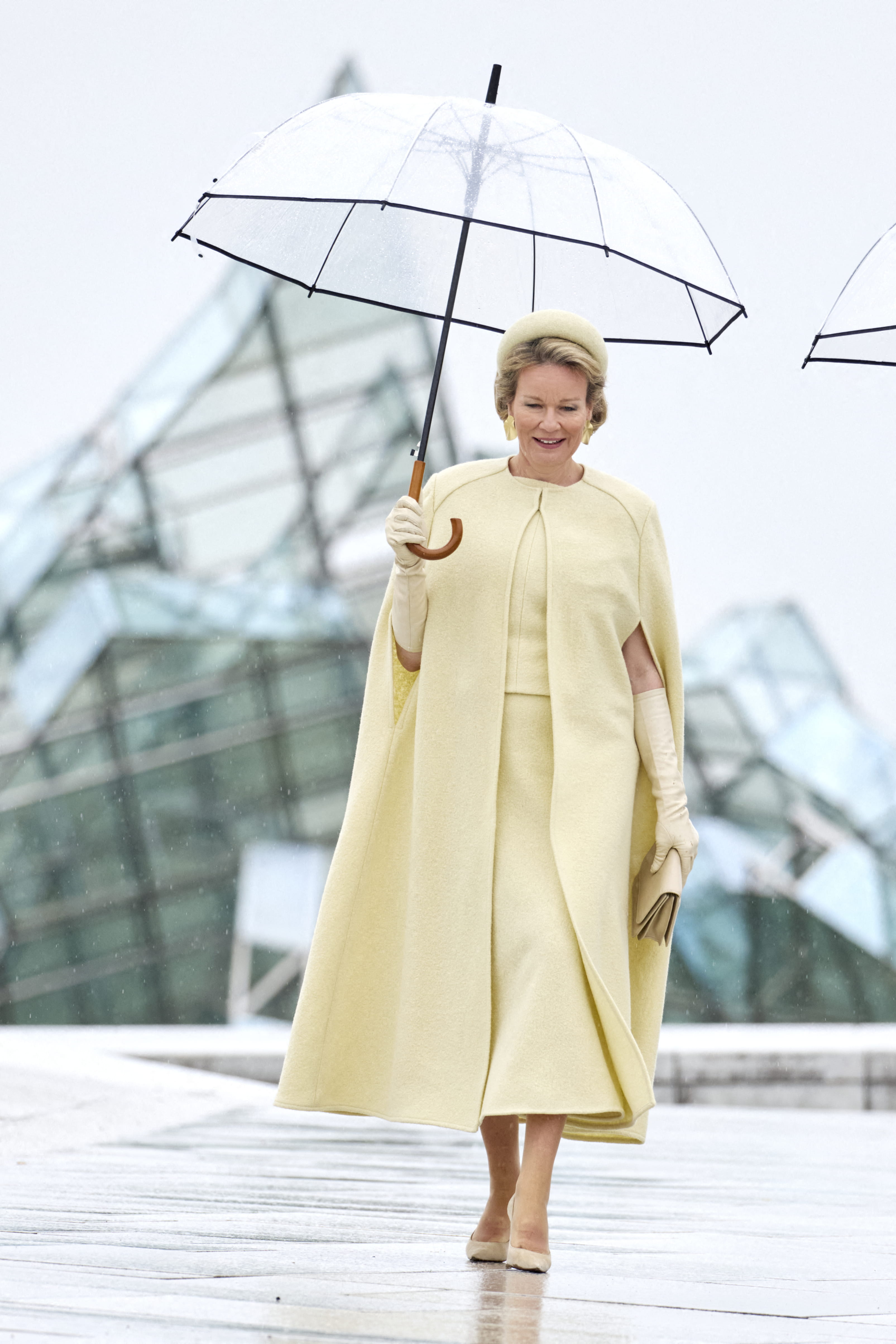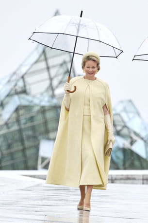 Même sous la pluie, Maxima des Pays-Bas est incroyablement stylée grâce à une silhouette monochrome et tendance. En effet, la reine apparaît dans une nuance jaune beurre très douce, qui apporte de la lumière malgré le temps pluvieux. La pièce maîtresse du look ? Cette longue cape structurée portée sur une robe coordonnée de longueur midi. L'ensemble est complété par des gants d'opéra en cuir beige clair et une pochette assortie, renforçant le côté protocolaire et chic. Elle porte aussi un bibi assorti, posé sur une coiffure impeccablement relevée. Le clou du spectacle ? Un accessoire pratique : le parapluie cloche transparent qui est choisi pour ne pas masquer la tenue.