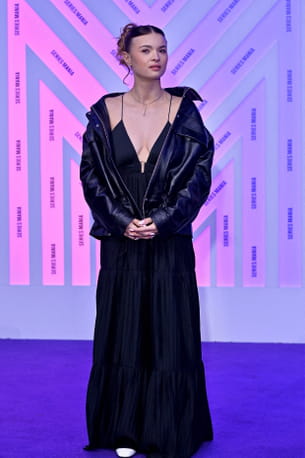 Pour le festival Séries Mania, Alice Cornillac adopte une esthétique "Goth-Chic" qui joue habilement sur le mélange des genres. La pièce centrale est une robe longue noire à fines bretelles, dotée d'un décolleté en V plongeant et d'une jupe plissée à volants. Pour casser le côté romantique, elle est surmontée d'un perfecto en cuir noir oversize porté de manière décontractée sur les épaules. Ce contraste entre la fluidité du tissu et le cuir brut crée une silhouette moderne et affirmée. Des escarpins blancs et un chignon haut complètent ce look minimaliste.