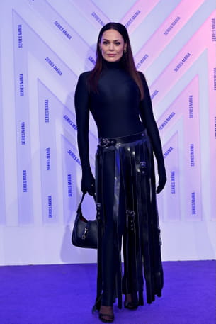 Pour le dernier jour du festival Series mania, Lola Dewaere a choisi un total look total black audacieux sur le tapis rouge. Elle porte une combinaison moulante à col montant et manches longues se terminant en gants, créant une silhouette seconde peau un brin futuriste. La pièce maîtresse est une jupe-ceinture spectaculaire composée de lanières de cuir verticales, ornées de boucles métalliques rappelant l'esthétique punk-chic ou gladiateur. Sa chevelure lisse et son maquillage sobre ajoutent une touche dark, parfaitement maitrisée.