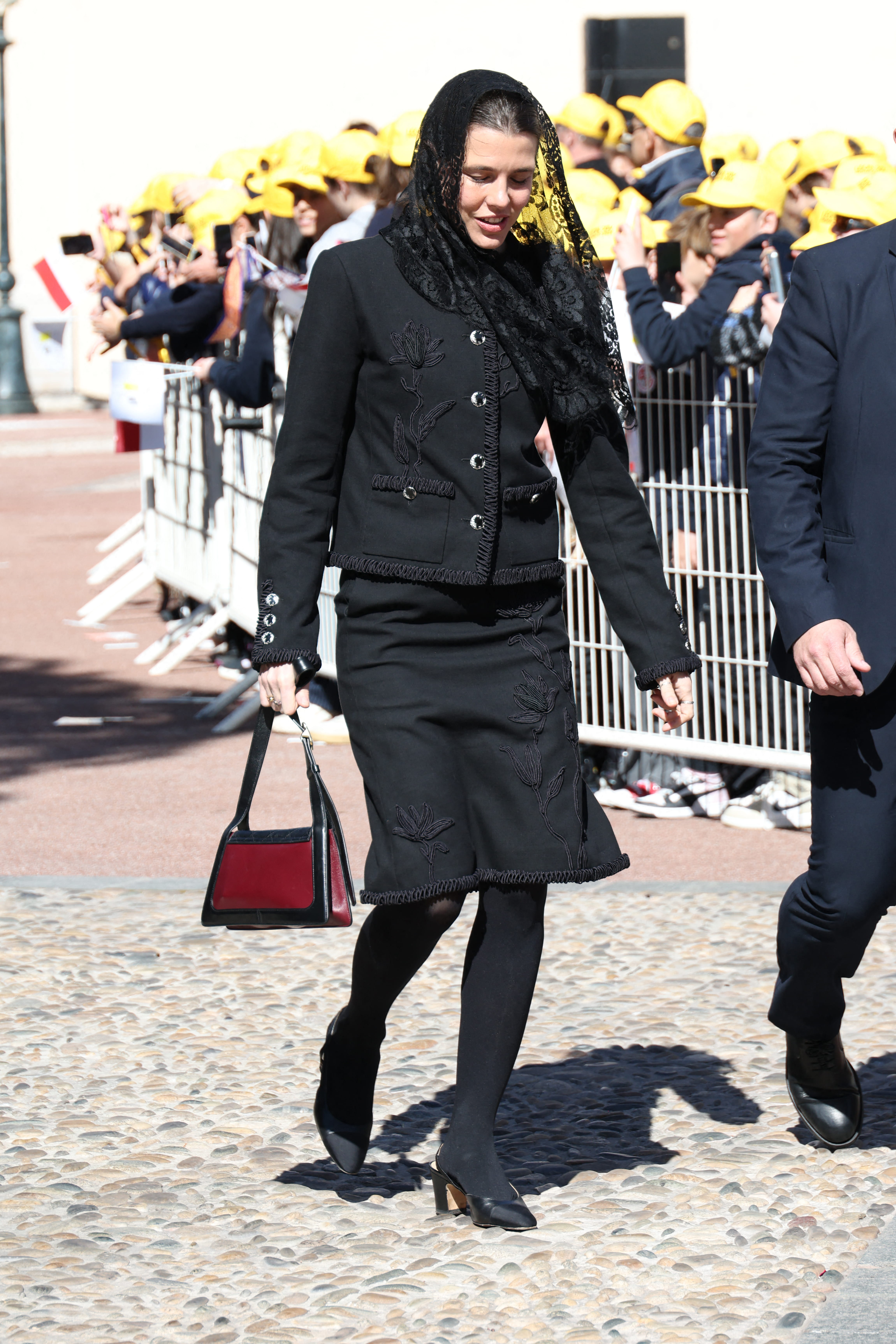 Charlotte Casiraghi était également présente pour rencontrer le pape à Monaco. Elle a choisi d'adopter un look d'une élégance solennelle, respectant les codes du protocole avec une touche couture. Elle porte un ensemble tailleur jupe noir magnifié par des broderies florales en relief et une veste courte, structurée par des boutons travaillés. Mais l'accessoire incontournable de son look reste cette mantille en dentelle noire portée sur la tête qu'elle est obligée de porter devant le souverain pontife. Pour dynamiser ce total look noir, elle mise sur un sac à main bicolore et termine sa tenue par des escarpins slingbacks à la pointe de la tendance.