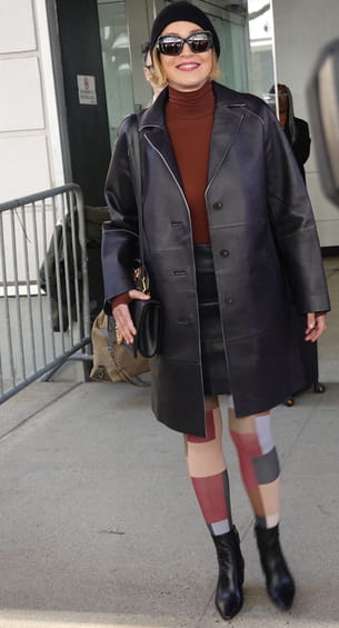 À New York, Sharon Stone offre aux photographes un look urbain audacieux. Elle porte un manteau long en cuir noir, superposé à un col roulé de couleur brique, une nuance chaude qui illumine son visage. La véritable singularité de cette tenue réside dans cette paire de collants à motifs géométriques multicolores, qui adoucit la rigueur du cuir. Elle complète l'ensemble avec des bottines noires à bout pointu, un bonnet en maille et de larges lunettes de soleil. Un mélange parfait entre glamour et street-style, porté avec l'assurance qu'on lui connait.