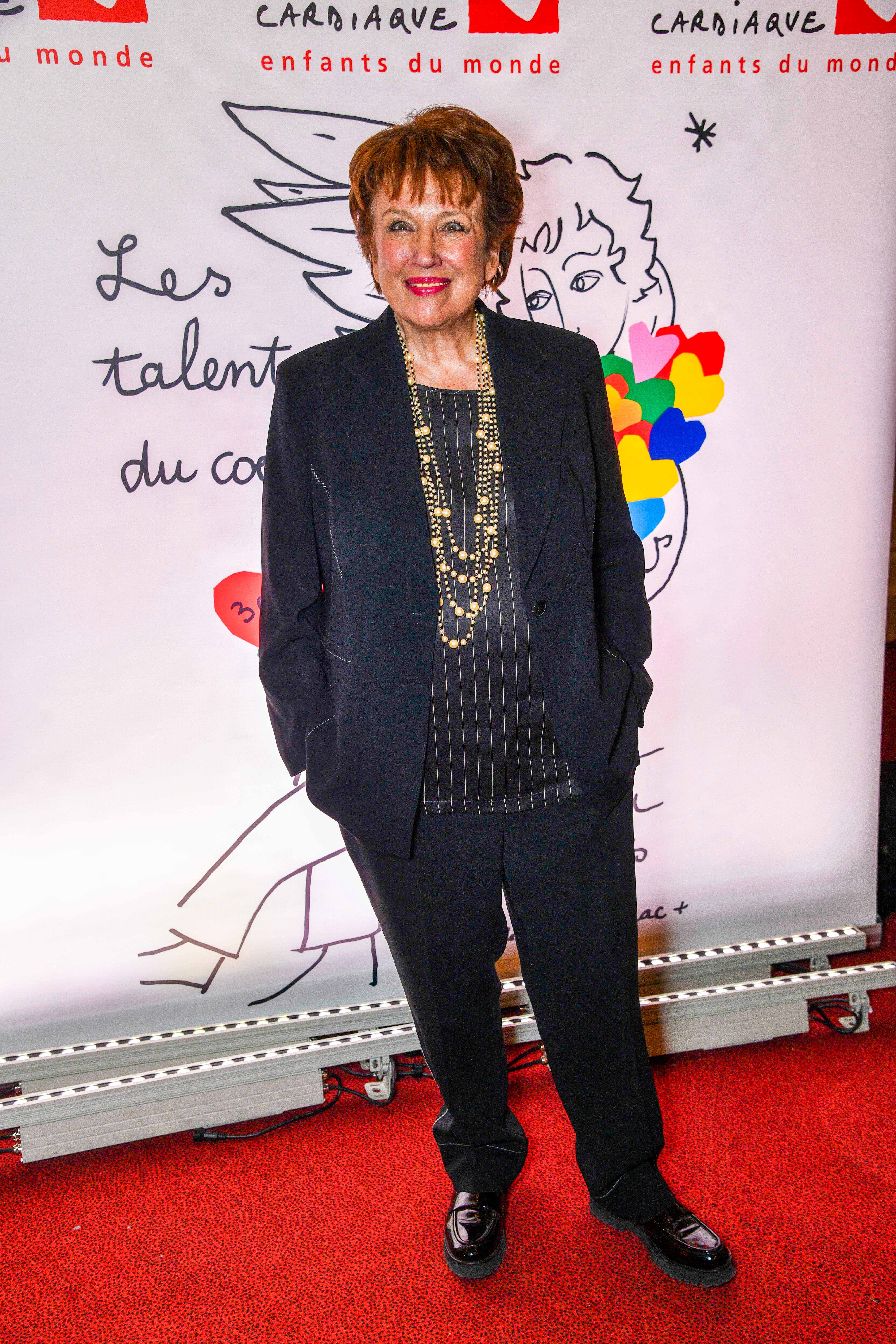 Pour participer au gala "Les talents du cœur", Roselyne Bachelot arbore un look tailleur-pantalon noir classique et élégant, privilégiant le confort sans sacrifier le style. Sa veste structurée est portée sur un top noir à fines rayures verticales blanches, apportant une touche de dynamisme à l'ensemble. Elle rehausse cette tenue sobre avec un sautoir multi-rangs de perles dorées qui illumine son buste. Aux pieds, elle opte pour des mocassins vernis noirs à semelles crantées, très tendance. Sa mise en beauté reste fidèle à elle-même : une coupe courte rousse et un rouge à lèvres rose vif.