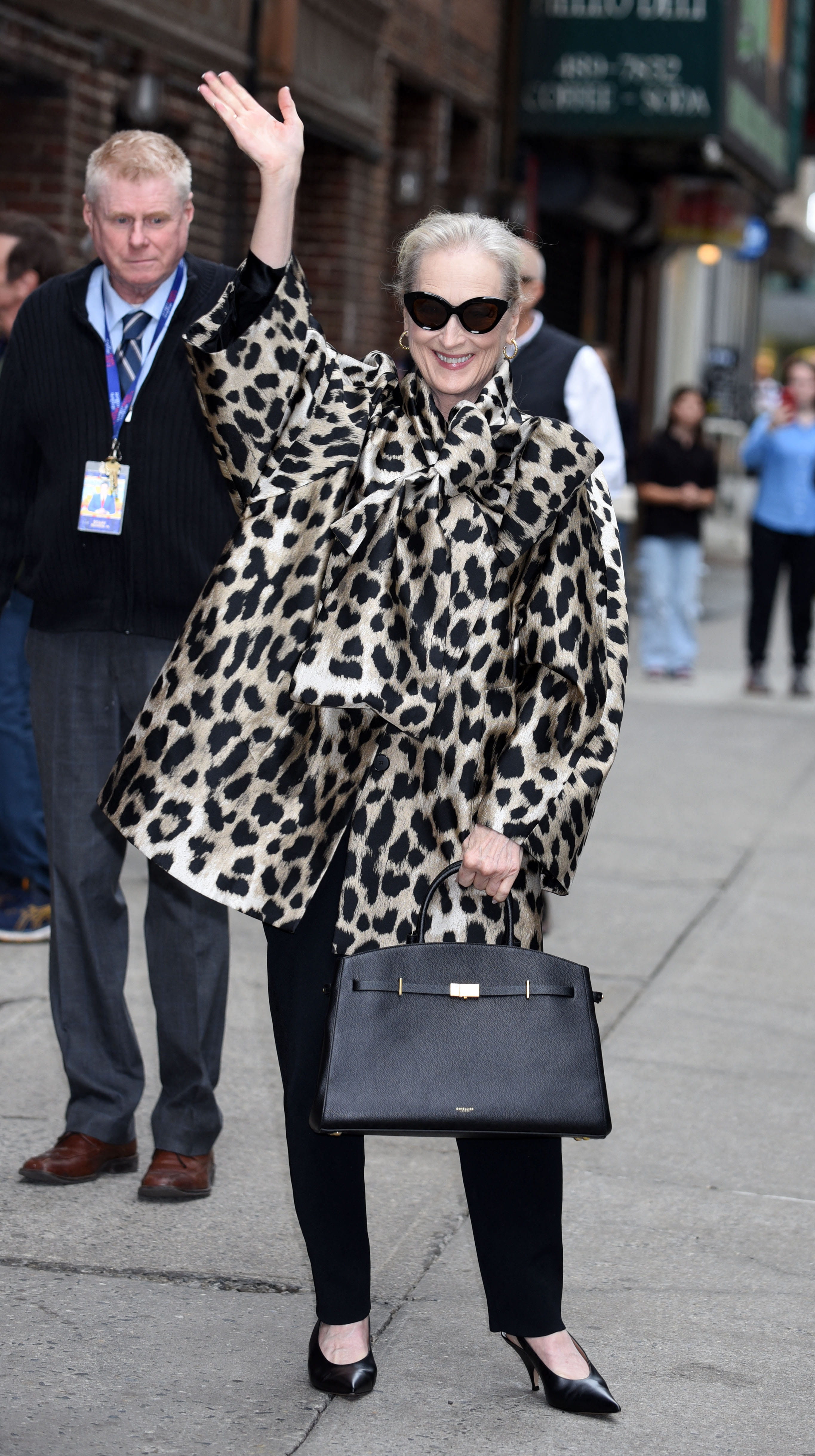 Dans les rues de New York, Meryl Streep se fait remarquer grâce à son look à la fois classique et audacieux. La pièce maîtresse est un manteau oversize à imprimé léopard, dont le volume dramatique est accentué par un nœud XXL au col, apportant une touche théâtrale irrésistible. Pour équilibrer cette pièce forte, elle mise sur une base sobre : un pantalon cigarette noir et des escarpins slingbacks à bout pointu, affinant sa silhouette. Côté accessoires, elle joue la carte du luxe discret avec un grand sac à main structuré en cuir grainé noir et des lunettes fumées, parfaites pour un look de star intemporel.