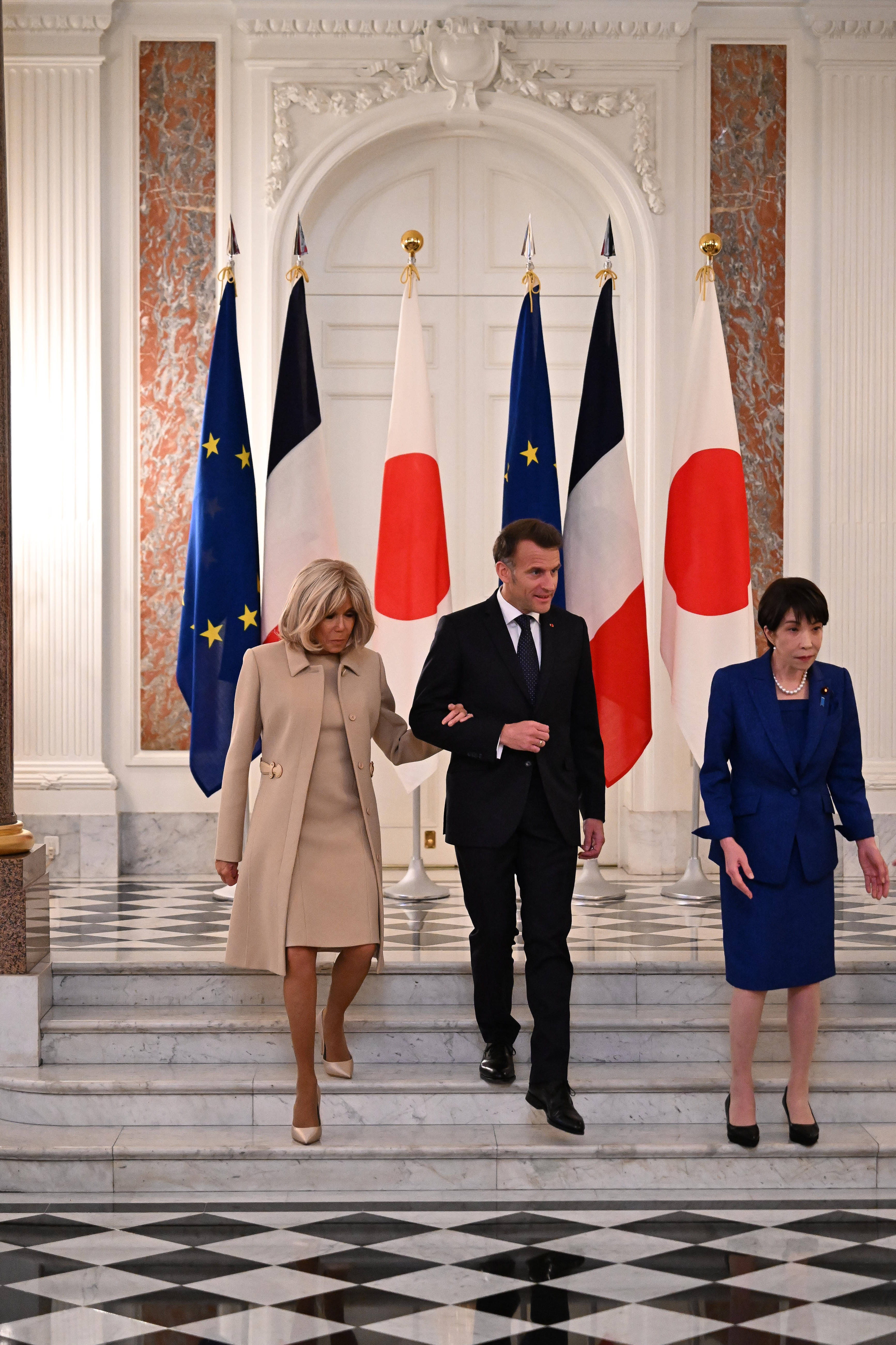 Pour rencontrer la Première ministre japonaise Sanae Takaichi à Tokyo, Brigitte Macron arbore un ensemble monochrome beige sable d'une élégance minimaliste. Elle porte une robe droite arrivant au genou, associée à un manteau long assorti à la coupe impeccable. Le manteau se distingue par ses détails raffinés, notamment des pattes de boutonnage dorées à la taille qui structurent la silhouette. Pour parfaire ce look sophistiqué, elle mise sur des escarpins à talons aiguilles d'un ton nude parfaitement coordonné. Sa coiffure, un carré blond volumineux, et son allure sobre soulignent un chic à la française maîtrisé, idéal pour cet événement diplomatique.