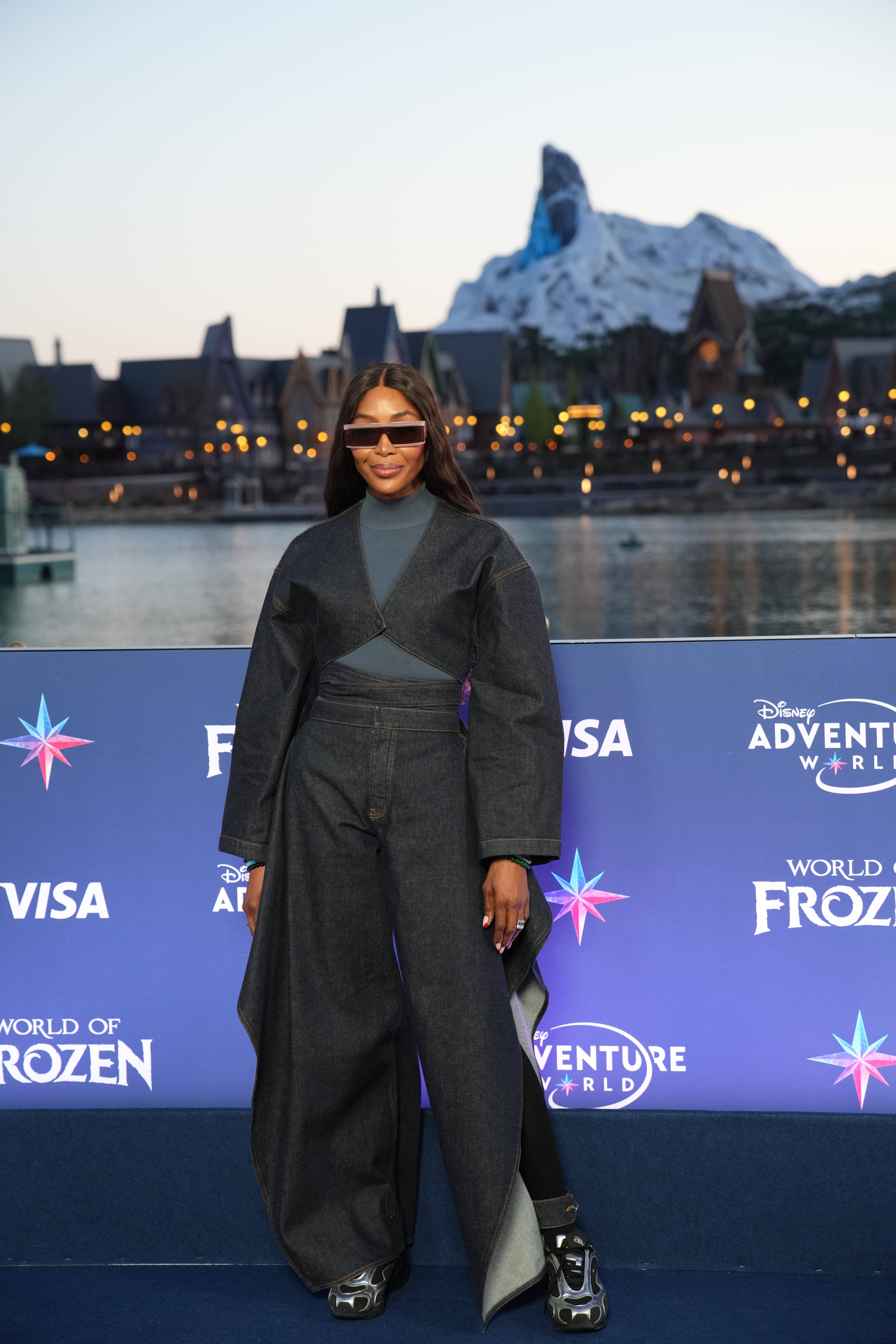 Lors de l'inauguration du land "World of Frozen" à Hong Kong, Naomi Campbell arbore un ensemble en denim brut très futuriste. Elle porte une veste courte aux manches larges et structurées, superposée à un top moulant gris à col montant. Le bas est composé d'un pantalon XXL ultra-large au drapé asymétrique, créant un volume sculptural unique. Pour parfaire ce look avant-gardiste, elle porte des lunettes de soleil rectangulaires à monture épaisse et des baskets sombres imposantes. Sa longue chevelure lisse et son port de tête altier renforcent cette allure de reine de la mode.