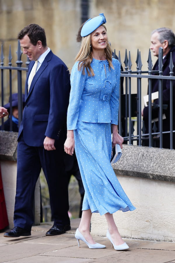 Harriet Sperling faisait partie des invités de la traditionnelle messe de Pâques qui avait lieu au château de Windsor ce dimanche 5 avril. La future épouse de Peter Phillips était rayonnante dans un ensemble bleu orné de pois blancs imaginé par la marque Beulah London. Il s'agissait d'une blouse à nœuds péplum et d'une jupe midi à la coupe trapèze. Elle avait également misé sur une paire d'escarpins en daim, une pochette assortie, des boucles d'oreilles en perles ainsi qu'un bibi légèrement incliné, accentuant l'aspect royal de son look.