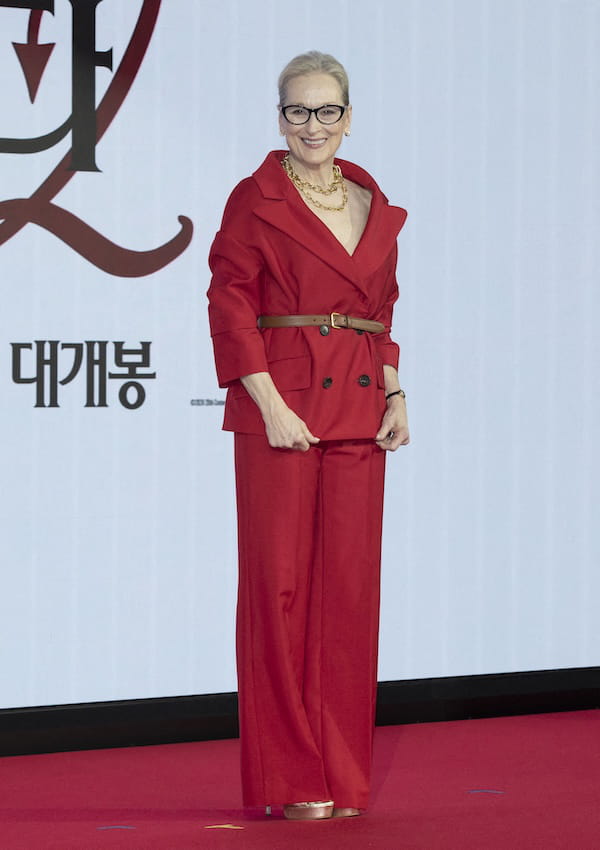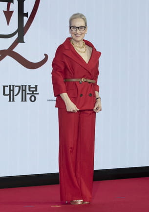 À l'occasion de la conférence de presse du film Le Diable s'habille en Prada 2 à Séoul, Meryl Streep a captivé tous les regards dans un ensemble rouge profond d'une élégance remarquable. Son tailleur impeccablement coupé se composait d'une veste à double boutonnage aux manches raccourcies et d'un pantalon de costume assorti. Mais ce sont surtout les accessoires qui signaient l'allure : une ceinture marron venant souligner la taille, des talons plateformes, un double collier chaîne, une montre Cartier ainsi que des lunettes de vue à monture œil de chat.