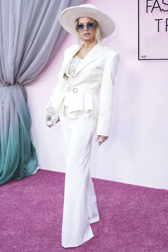 Fergie a brillé lors de la quatrième édition des Fashion Trust US Awards à Los Angeles grâce à un ensemble blanc des plus éblouissants. La chanteuse est apparue dans un tailleur-pantalon remarquable composé d'une veste effet péplum portée sur un top aux détails argentés scintillants. Le pantalon, volontairement très long, venait entièrement dissimuler ses chaussures.  Impossible en revanche de manquer sa pochette métallisée, son chapeau en feutre immaculé ainsi que ses lunettes rondes aux verres fumés.