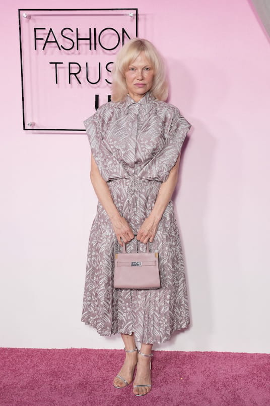 Ce mardi 7 avril, de nombreuses célébrités s'étaient donné rendez-vous à la quatrième édition des Fashion Trust US Awards. Parmi elles, Pamela Anderson a attiré tous les regards lors de son arrivée sur le photocall rose. L'actrice avait opté pour une élégante robe chemise imprimée en soie, reconnaissable à ses deux pans venant se nouer à la taille et à sa jupe plissée tombant au niveau des chevilles. Parfaite jusque dans les moindres détails, elle complétait sa silhouette avec un brushing lisse, un mini sac rose poudré et une paire de sandales argentées minimalistes.