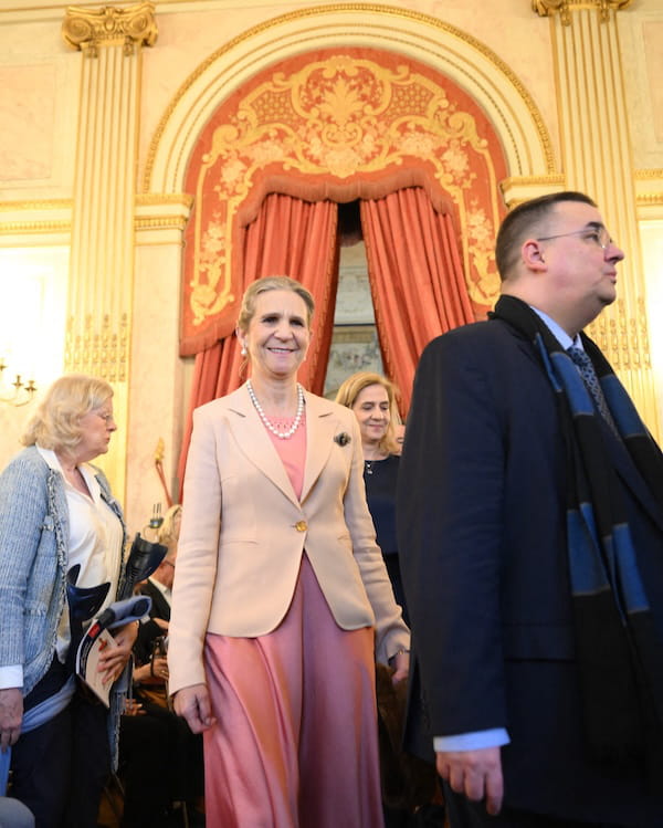 À l'occasion de la remise du Prix du Livre politique à l'Assemblée nationale, où elle accompagnait le roi Juan Carlos d'Espagne, l'infante Elena a fait une apparition remarquée. Vêtue de rose de la tête aux pieds, elle arborait un top délicatement ajouré au niveau du col, associé à une longue jupe en satin apportant une touche d'élégance fluide. Par-dessus, elle portait un blazer rose pâle fermé par un bouton et orné d'une broche raffinée. Son look était complété par une parure de perles qui comprenait un collier et des boucles d'oreilles.