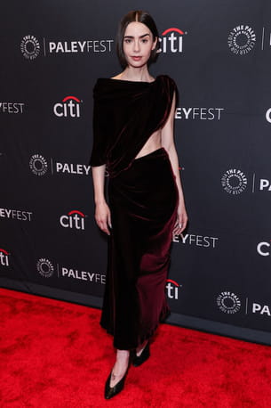 Lily Collins capte toute l'attention dans une robe en velours Balenciaga