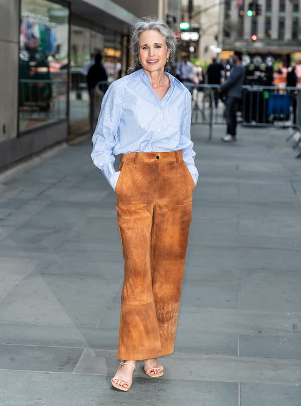 Aperçue devant le plateau du Today Show le 15 avril dernier, Andie MacDowell a une nouvelle fois confirmé son sens du style. Elle n'a pas hésité à adopter un pantalon en daim marron, matière habituellement associée aux saisons froides, pour son look du jour. Le modèle se distinguait par une taille haute et une coupe flare légèrement évasée à partir du genou. La touche chic ? Une chemise à fines rayures qui accompagnait parfaitement le tout. Des sandales beiges et de petites boucles d'oreilles dorées venaient enfin compléter ce look harmonieux.