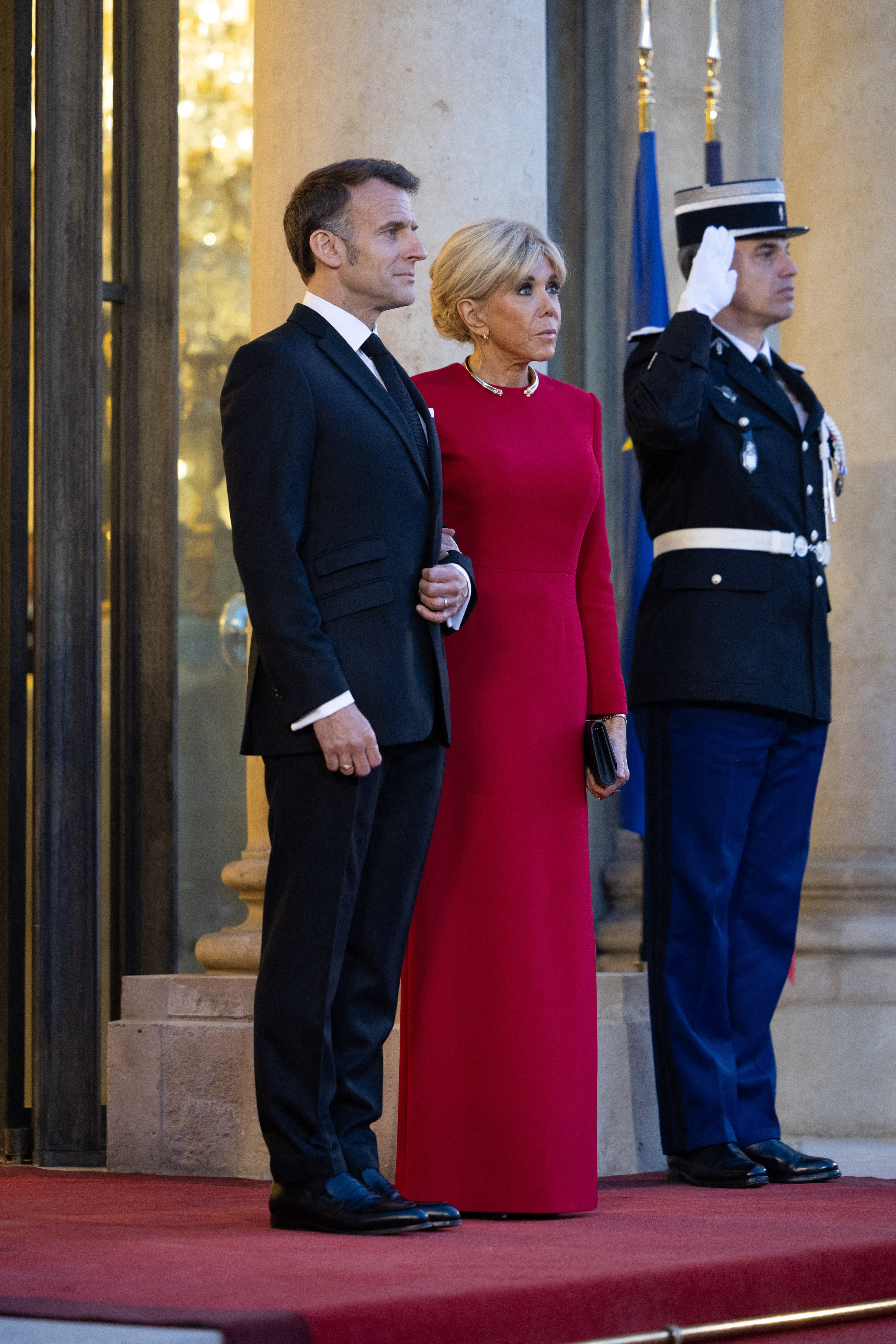Pour assister à un banquet d'état au palais de l'Élysée à Paris, Brigitte Macron arbore une robe longue, d'un rouge carmin vibrant qui se distingue par une coupe épurée. Près du corps, elle allonge la silhouette en un temps record. Le point central du look réside dans l'encolure : un ornement métallique rigide, semblable à un bijou, vient structurer le port de tête et remplace avec modernité les parures traditionnelles. Ce choix chromatique audacieux, associé à des manches longues et une taille discrètement cintrée, démontre une maîtrise parfaite des codes de l'élégance.