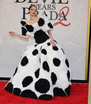 L'avant-première mondiale du Diable s'habille en Prada 2 a eu lieu il y a quelques jours à New York ! Pour l'occasion, Coco Rochas a craqué sur une tenue extravagante et théâtrale à travers une robe dalmatien. La robe se distinguait par un contraste chromatique radical en noir et blanc, ornée de pois géants tout doux. La coupe présentait un bustier aux épaules dénudées et une ceinture noire qui marquait la taille. Ses paupières fardées de pourpre et ses lèvres rouge sombre, accentuaient l'esthétique "haute couture" de ce look audacieux.