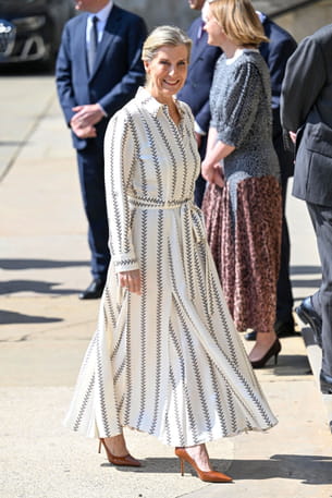 Sophie d'Edimbourg incarne une élégance printanière avec cette robe chemise longue. Cette pièce d'un blanc cassé lumineux est rythmée par des rayures verticales composées de petits motifs noirs graphiques qui élancent la silhouette. Une ceinture assortie nouée à la taille souligne également ses corps. Le bas de la robe, très évasé, apporte un mouvement aérien et sophistiqué à chaque pas. Pour compléter ce look, son choix s'est porté sur des escarpins à talons hauts en cuir marron façon croco. En un mot : superbe !
