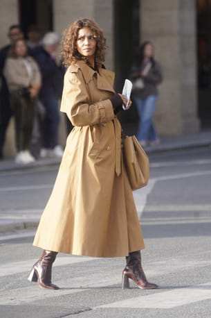 Photographiée lors d'un tournage parisien, Halle Berry a livré une interprétation magistrale du chic urbain avec ce trench-coat long de couleur camel. La coupe, structurée par des épaulettes et cintrée à la taille, s'évase en une jupe monumentale qui apporte une grande élégance à sa démarche. Pour ponctuer ce look, elle a misé sur des bottes hautes en cuir bordeaux au talon géométrique et un sac cabas assorti au manteau qui complétait cet ensemble monochrome. Un parfait équilibre entre classicisme et modernité.