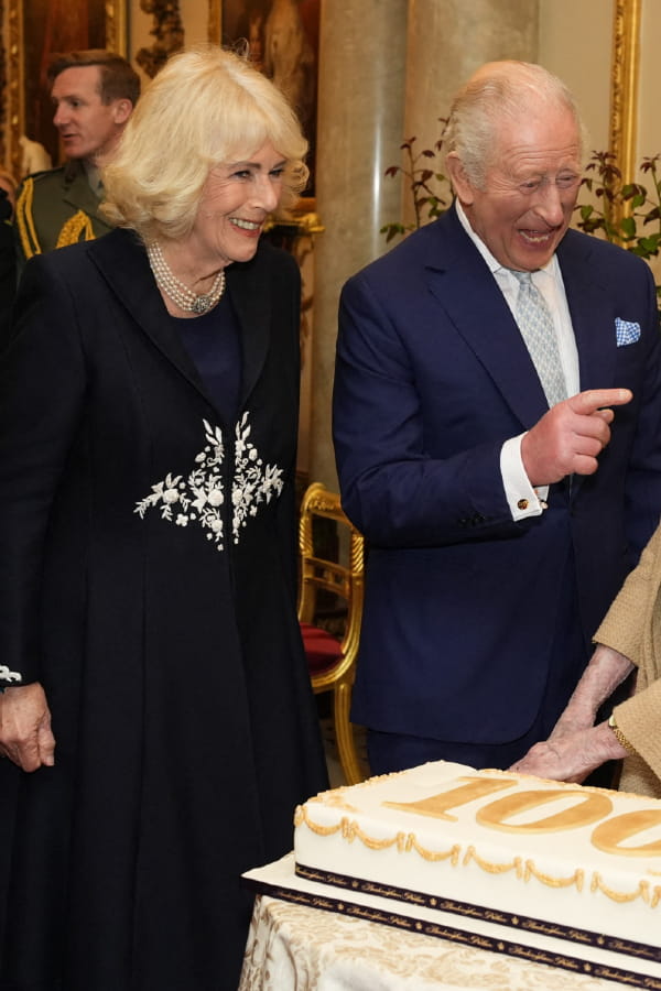 Pour le centenaire de la naissance d'Elizabeth II, Camilla Parker-Bowles a sorti de son dressing une pièce chic signée Fiona Clare Aldridge. Cette robe-manteau noire dispose d'un col montant et d'une broderie florale blanche complexe en forme de losange à la taille, apportant une touche de lumière et de féminité à l'ensemble. Le raffinement est accentué par un collier de perles à quatre rangs, grand classique de la joaillerie. Les poignets rappellent discrètement les motifs brodés du buste, créant une parfaite harmonie visuelle. Un look simple mais soigné, fidèle à la reine.