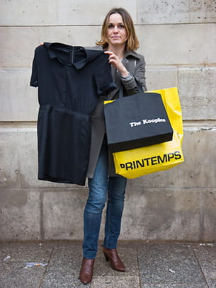 "Je suis contente car j'ai bénéficié pour cette robe The Kooples, d'une réduction de 50%. J'avais posé un RTT à l'avance spécialement pour ce premier jour de soldes. Je me suis arrangée pour laisser homme et enfant(s) à la maison pour être tranquille. J'avais aussi prévu de m'acheter un manteau, ce que j'ai fait, mais là j'ai déjà largement dépassé le budget de 200 € que je m'étais fixé : il faut que je m'arrête !"