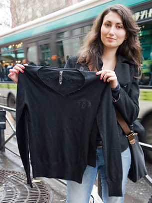 Sandra et son nouveau pull Kaporal. © Journal des Femmes/Cécile Debise