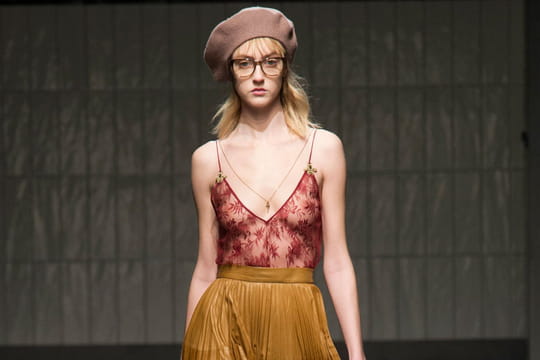 Pour son premier défilé Gucci, Alessandro Michele, le DA successeur de Firda Giannini, propose un défilé en totale rupture avec ce qui pouvait se faire avant dans la maison italienne. Pour l'hiver 2015-2016 il propose une jeune femme très vintage, aux allures d'étudiante paumée, qui semble s'habiller de bric et de broc dans les friperies du coin. Cette fille excentrique à grosses lunettes - qui lui donnent l'air très faussement intello - sait tout de même avoir du style et dégage quelque chose de mystérieux et d'envoutant. Elle adore mixer la jupe midi, le long manteau de fourrure et les mocassins, telle une Margaux Tennenbaum sortie tout droit d'un film du décalé Wes Anderson. Et par-dessus tout, la jeune femme Gucci aux airs de "geek-hipster" adooooore les cols lavallières et les bérets ! Côté couleurs, on est dans une large gamme chromatique où les couleurs prédominantes sont tout de même le camel, le vert olive, le rouge, le brique, le noir et le beige.