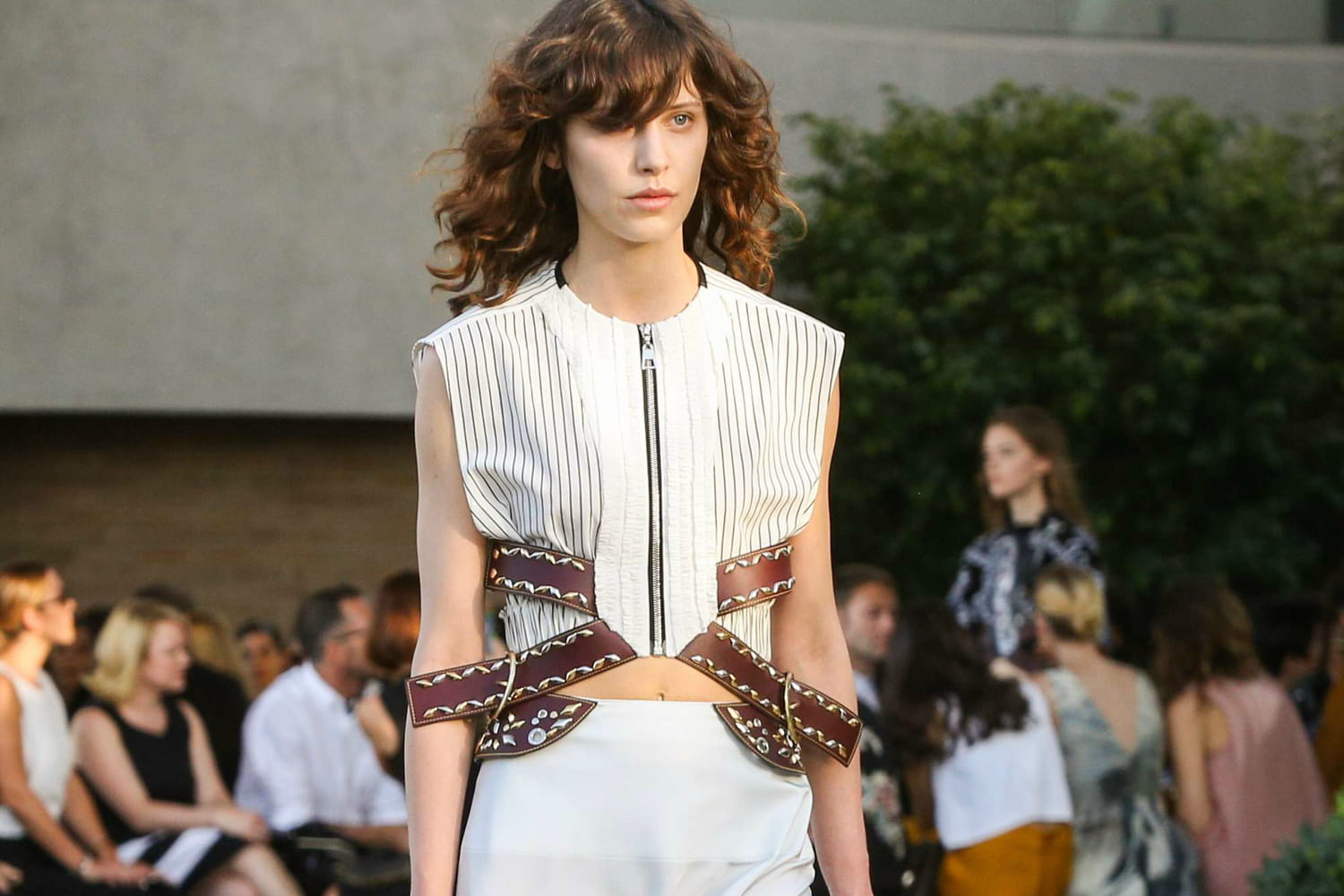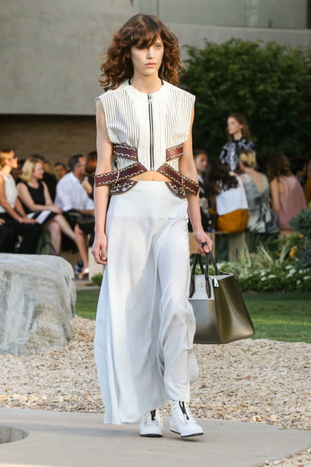 Cette dualité se retrouve effectivement dans la collection Croisière, où volumes fluides virevoltants s'opposent à des coupes plus rigides et structurées marquant la taille de fines ceintures, où la légèreté de matières comme la mousseline de soie contraste avec l'aspect brut du cuir et de zips argentés, où les détails modernes voire futuristes rencontrent l'inspiration Renaissance. Cinquante silhouettes nous proposent donc un savant mix & clash ; le romantisme de pantalons vaporeux et évasés style palazzo est associé à des tops ornés de sangles en cuir, qui laissent entrevoir le ventre mais camouflent les bras avec des manches bishop à la longueur XXL. Parfois, les pantalons sont superposés de jupes transparentes ou disparaissent simplement au profit de longues jupes fendues. Là aussi, la dichotomie est réelle, entre jambes camouflées sous de larges pantalons et shorts aux allures de culotte qui dévoilent le corps sans pudeur. Côté accessoires, godillots, tongs ou sneakers montantes contrastent avec la finesse des vêtements et l'élégance des sacs très structurés, qui remettent sur le devant de la scène la malle aperçue sur le défilé Automne-Hiver 2015/2016.