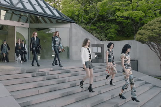 Sur un podium immaculé au milieu d'une gigantesque forêt, une guerrière japonaise s'avance, tenue de combat militaire sur le dos, l'air déterminé. Serions-nous revenus à l'ère des samouraïs ? Cela y ressemble, mais cette mise en scène est en réalité celle du défilé Louis Vuitton Croisière 2018. La griffe de luxe présentait sa nouvelle collection au Musée Miho de Kyoto le 14 mai. Le lieu choisi par la marque française était d'une beauté incomparable, les tops évoluant sur un immense pont dressé au-dessus de la végétation luxuriante. Chère à Nicolas Ghesquière, directeur artistique de la maison, l'esthétique nippone a occupé le devant de la scène du défilé, sous les yeux d'invités prestigieux, de Michelle Williams à Isabelle Huppert.