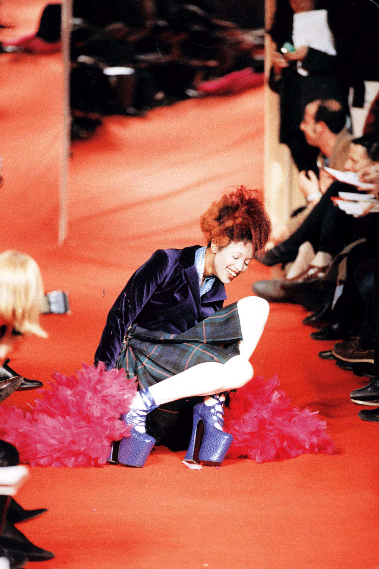 Naomi Campbell en plateformes violettes compensées et jupe à carreaux au défilé Vivienne Westwood à Paris le 17 mars 1993.