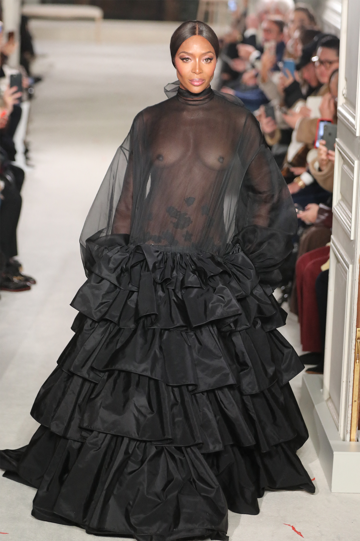 Naomi Campbell en robe noire transparente à volants au défilé Valentino à Paris le 23 janvier 2019.
