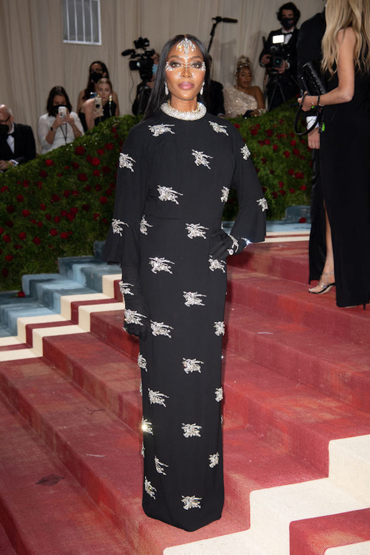 Naomi Campbell en robe longue noire à logos imprimés Burberry au Met Gala à New York le 2 mai 2022.